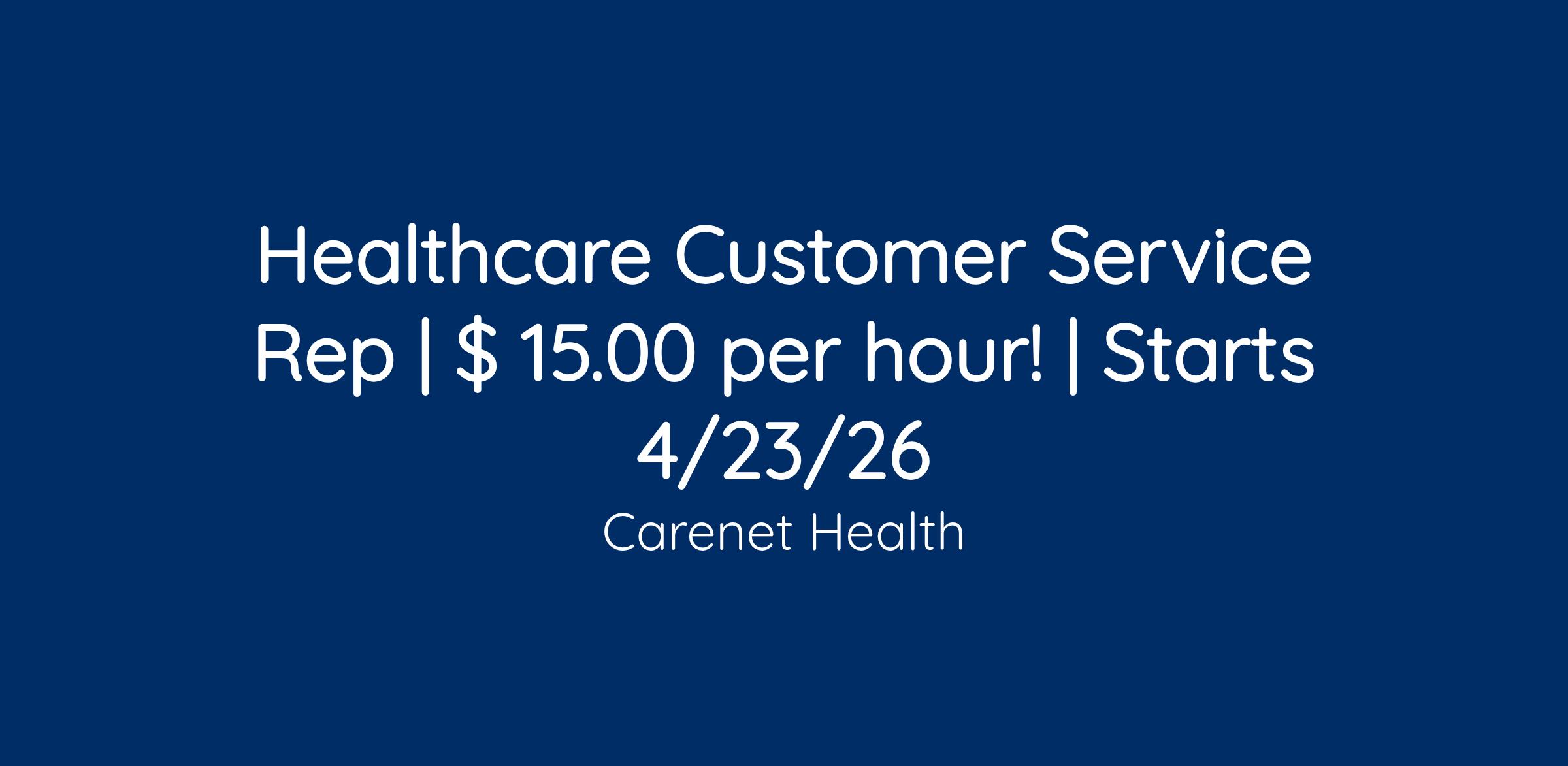At Carenet Health, we value the expertise and dedication of our team members, and we are committed to offering an appealing compensation package. The wage for the Healthcare Customer Service Rep is $15.00 per hour.